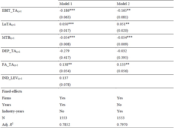 In Table 3, Model 1, we run a fixed effect (firm and year) regression with traditional determinants of capital structure commonly found in tests of speed of adjustment of leverage (e.g., Flannery & Rangan, 2006). Model 2, in turn, does not include the mean industry leverage as a regressor, but controls for firm fixed-effects and the interaction between industry and years. Regardless of the specification, the results are similar between the two models and the coefficients signs are consistent with previous studies. We avoid analyzing every single variable because our main interest relies only on the fitted values generated by these regressions. However, it is important to notice that the adjusted R2 of both models are somewhat high, around 79%, suggesting that these models can explain a large portion of the leverage variance.