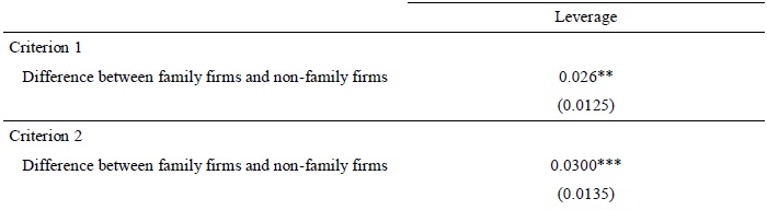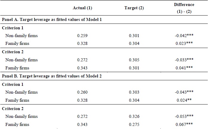 Regarding the distance from target leverage, Table 10 shows that, regardless of the criterion, family firms are still significantly over-leveraged while non-family firms are under-leveraged.