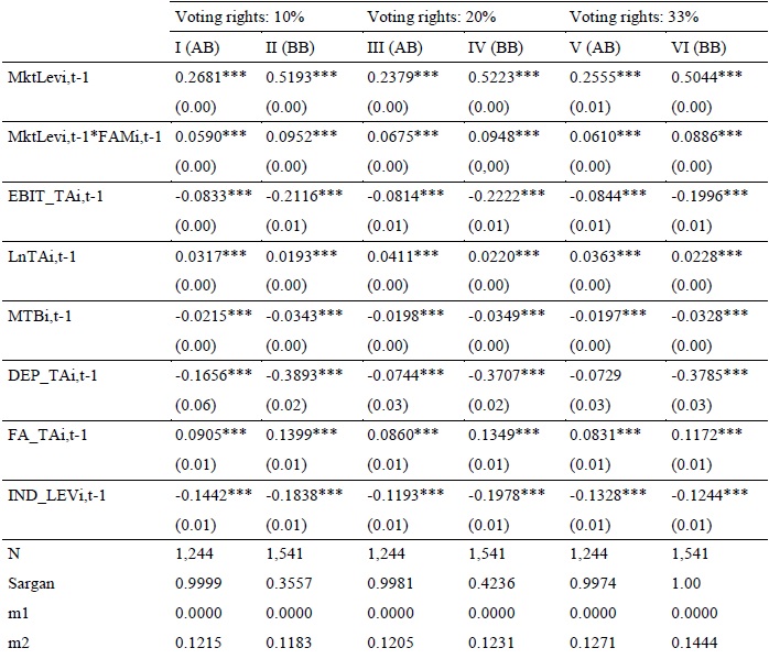 We test the robustness of our results by applying alternative definitions for family firms because the literature contains many variants. Table 7 shows the results of using three different definitions for family companies: (a) the LUS is a family and holds at least 10% of the voting rights (Maury, 2006), (b) the LUS is a family that holds at least 20% of voting rights (La Porta, Lopez-de-Silanes, & Shleifer, 1999), and (c) a family or a person owns 33% of the company's voting rights (Barth, Gulbrandsen, & Schønea, 2005). As in Table 6, the coefficients in the odd columns were estimated with the Arellano and Bond's (1991) difference GMM estimator, and those in the even columns were estimated by applying the Blundell and Bond's (1998) system GMM estimator. The results remain qualitatively unaltered. All instruments are valid, the coefficients are significant, and there is no serial correlation. Confirming our previous analyses, the positive and significant coefficients of the interaction variable (LEVi,t-1 * FAMi,t-1) indicate that family companies are slower than non-family companies.