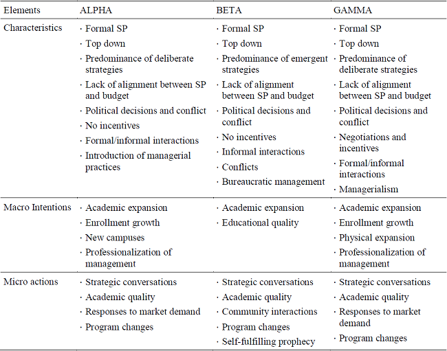 However, we found that the vast majority of strategic actions that are effectively executed are less the result of the Strategic Plan and much more the result of a self-fulfilling prophecy, strategic conversations (Weick, 1995) and spontaneous initiatives of academic managers and professors. The most important aspects regarding how strategies occur in the universities in question are summarized in Table 2.