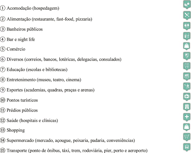 A segmentação dos locais/prédios por classes ou tipos de comércio se dá pela necessidade de oferecer ao usuário uma opção rápida e eficiente na busca por um determinado tipo de comércio, serviço ou ponto de interesse (POI). A separação ocorreu conforme a proposta na Figura 6.