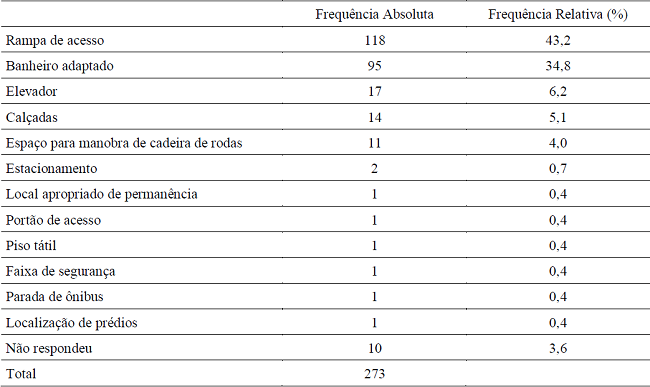 A partir das entrevistas foi possível constatar que entre os maiores problemas da cidade estão a irregularidade das calçadas e a falta de rampas de acesso. Durante as falas dos entrevistados, foi constante a referência às irregularidades, aos buracos, aos obstáculos, aos rebaixamentos de meiofio e à largura das calçadas. Outro aspecto bastante citado é relativo aos ônibus disponíveis em termos de quantidade, horários e seus respectivos acessos para embarque e desembarque.