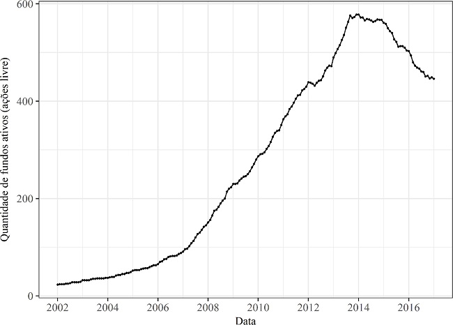 Os fundos de investimento em ações livre apresentaram acentuado crescimento mensal de oferta ao longo do período de 2002 a 2016. Como apontado na Figura 1, nos últimos quinze anos a categoria confirma a tendência de crescimento da modalidade de investimento apontada pela ANBIMA. No início do período, tem-se uma quantidade mensal de fundos inferior a 50 ativos, que atinge quantidade superior a 400 em dezembro de 2016, significando um crescimento superior a 800% em menos de vinte anos.