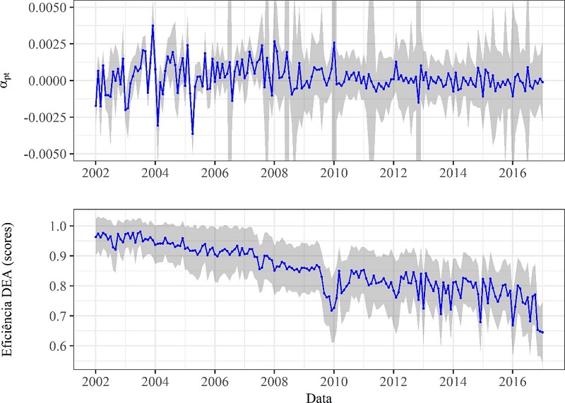 A correlação mensal da eficiência com os retornos reais foi mais baixa, em torno de 0, e mais dispersa no pré-crise do que no pós-crise, assim como ocorrido com a correlação entre alfas e scores, demonstrada na parte inferior da Figura 4. Embora ambos sejam estimadores consistentes de performance, como apontado pela literatura, respectivamente, nos estudos de Nerasti e Lucinda (2016) e de Basso e Funari (2017).
