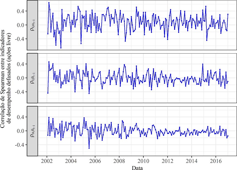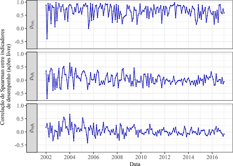 De acordo com as correlações dos ranks de indicadores de desempenho dos fundos apresentadas na Figura 4, alfas e retornos reais, eficiência e retornos reais, e alfas e eficiência, os coeficientes de Spearman apontam que os alfas têm maior relação com os retornos reais dos ativos do que com a eficiência. A correlação entre alfas e retornos reais foi, na maioria, acima de 0,5, com dispersão ao longo de todo o período.