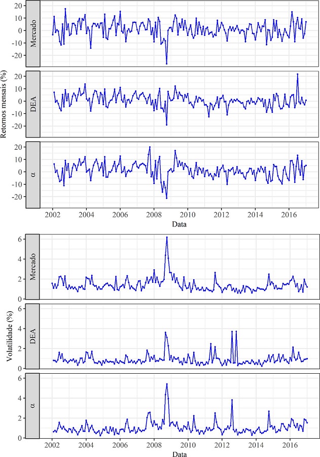 As carteiras teóricas pautadas na eficiência como critério de avaliação apresentaram retornos médios superiores aos daquelas baseadas nos maiores alfas na maior parte do tempo, mas bem semelhantes ao mercado. Esse resultado de desempenho superior das careiras baseadas na análise envoltória corrobora parcialmente os apresentados por Lopes et al. (2008) e Rotela et al. (2014), em que as carteiras bateram também o mercado. No entanto, torna-se válido ressaltar, ainda, que as carteiras baseadas em eficiência foram também mais voláteis que aquelas de maiores alfas.