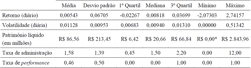 As estatísticas descritivas das variáveis apresentadas na Tabela 1 indicam que, na média mensal, os fundos apresentaram 0,05% de retorno mediante um alto risco, com volatilidade média de 1% ao mês no período. Além disso, o patrimônio líquido apresentou montantes significativos alocados na indústria. Em termos de custos, nota-se uma cobrança de taxa de administração de 0% a 12% ao ano e média de 1,58%, com a cobrança de taxa de performance realizada por 46% dos fundos, quase metade da amostra com o custo.