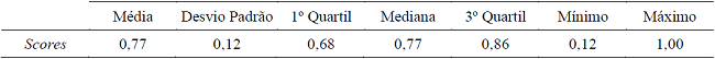A Tabela 3 apresenta as estatísticas descritivas dos scores mensais de eficiência obtidos com o DEA. Observa-se que a eficiência média dos fundos de investimento em ações livre no período foi de 77%, com um desvio-padrão de 12%, sendo que a menor eficiência encontrada entre os ativos foi de 12% ao mês no período. Como apontam Bisso et al. (2016), há uma tendência de eficiência média com o baixo desvio entre os fundos avaliados.