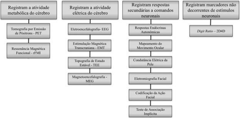 As principais formas de coleta de dados originadas da neurociência se dividem em três grandes grupos: (a) coletam informações sobre a atividade metabólica do cérebro; (b) sobre a atividade elétrica do cérebro; ou (c) coletam informações secundárias, decorrentes da atividade neural, como frequência cardíaca ou diâmetro das pupilas (Butler, 2008; Habel et al., 2007; Javor et al., 2013; Kenning & Plassmann, 2005; Zurawicki, 2010). Os registros de atividade metabólica e elétrica no cérebro são as medidas mais encontradas em estudos de neurociência na administração, enquanto há pouca discussão sobre o uso de respostas secundárias a comandos neuronais, os quais possuem formas de mensuração mais simples e práticas. A Figura 1 ilustra algumas dessas formas de coleta, com suas metodologias próprias e medidas decorrentes. Também ilustra um quarto grupo de medidas que não são decorrentes de estímulos neuronais, mas que podem ser bastante úteis nesse tipo de investigação. Aplicações de pesquisa para essas medidas estão expostas na seção Principais Aplicações em Marketing.