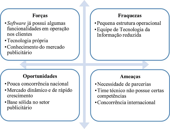 De acordo com Porter (2004), o primeiro passo para a definição do posicionamento estratégico de um produto no mercado é a identificação das suas forças e das suas fraquezas. O autor sugere que as informações devem ser organizadas por intermédio da matriz Strengths, Weakness, Opportunities e Threats (SWOT) que representa as forças, as fraquezas, as oportunidades e as ameaças do negócio. Portanto, a análise SWOT ajudaria a Casa Vaticano a identificar as fragilidades e as potencialidades do software Jamworks (Figura 2).