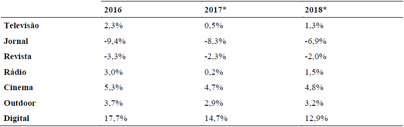 Os gastos com publicidade no Brasil giraram em torno de US$ 16,6 bilhões em 2016, sendo 20% desse valor aplicados nos meios digitais, segundo um estudo realizado pela consultoria britânica Dentsu Aegis Networks (2017). Esse estudo indica, ainda, que os anúncios digitais devem ganhar força nos próximos anos, totalizando US$3,3 bilhões já em 2018 e que eles superem gastos com mídias tradicionais, como jornais e revistas, em 2017 (Tabela 1).