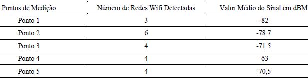 Um estudo mais específico, realizado em uma das praças do bairro da Guanabara (Figura 4) apresenta a média do nível de sinal capturado em cinco diferentes pontos. Todos os resultados, expressos em unidade de potência dBM e apresentados na Tabela 2, são provenientes de redes WiFi dos moradores do entorno da praça e remetem à viabilidade técnica diante de uma eventual necessidade de transmissão de dados.