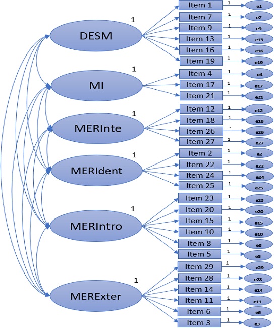 O modelo reespecificado mostrou um bom ajustamento, X2/gl = 3.322, CFI = .920, NFI = .890, RMSEA = .064, 90% CI [.056 , .067], P (rmsea <= .05) < .001. A análise das estimativas dos parâmetros revelou que os fatores MERInte e MI apresentaram a maior correlação, estando fortemente correlacionados (r = .817, p < .001), seguindo-se os fatores MERInte e MERIntro (r = .586, p < .001) e os fatores DESM e MERExter (r = .529, p < .001). Todos os índices saturam no respetivo fator com pesos fatoriais a variar entre .155 e .932.