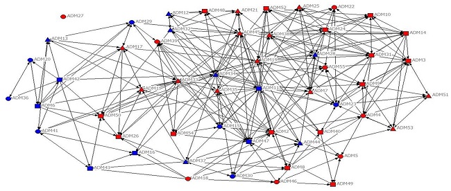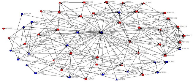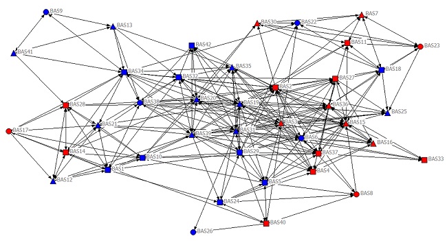 A seguir, são expostas as redes informais e formais da turma 1 (2º semestre) e da turma 2 (6º semestre). Nestas redes, estão inseridas as notas que cada aluno atribuiu a si considerando seu nível de relacionamento com os demais colegas (de 0-4 representadas por círculo, 5-7 por um quadrado e 8-10 por um triângulo). Também estão diferenciados os gêneros por cores, sendo azul para o masculino e vermelho para o feminino. Optou-se por inserir a legenda somente na Figura 1, já que foram mantidas as mesmas representações nas demais figuras.