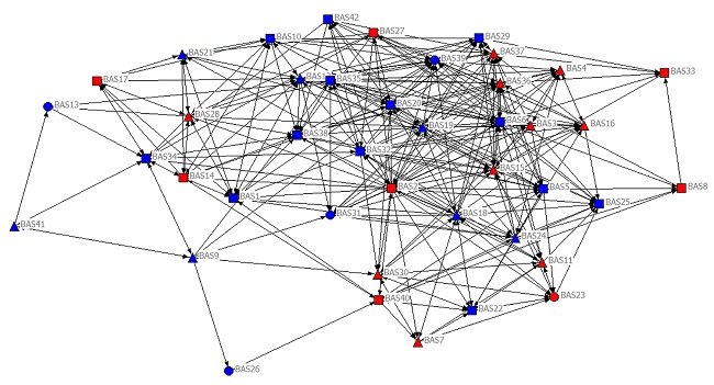 As notas que os participantes atribuíram a si mesmos acerca do nível de relacionamento informal e formal foram tabuladas e ilustradas por figuras geométricas, de forma que o círculo representa a faixa que compreende as notas de zero a quatro (nível inexistente ou baixo de relacionamento com os demais colegas), o quadrado ilustra a faixa que compreende as notas de cinco a sete e o triângulo denota as notas de oito a dez (alto nível de relacionamento). Além disso, o gênero dos participantes também foi ilustrado por cores diferentes, sendo os atores masculinos representados na cor azul e os femininos na cor vermelha.