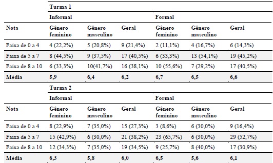 Com relação ao relacionamento informal entre as turmas, um aspecto a se destacar foi o aumento da média das notas do gênero feminino, de 5,9 da turma 1 para 6,3 da turma 2, e uma queda da média das notas do gênero masculino, de 6,4 da turma 1 para 5,8 da turma 2. Com esse resultado, pode-se admitir que o gênero feminino, com o passar do tempo e com um maior período de convivência, tende a se atribuir notas mais altas na variável relacionamento, enquanto que o gênero masculino tende a se atribuir notas mais baixas. E essa constatação se evidencia quando comparamos o relacionamento formal entre as turmas. Embora a média das notas do gênero feminino tenha sofrido uma pequena variação para baixo, de 6,7 da turma 1 para 6,5 da turma 2, a média das notas do gênero masculino sofreu uma variação maior, de 6,5 da turma 1 para 5,6 da turma 2. Os resultados corroboram Waldstrom (2001) e Mohammadi et al. (2012).