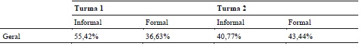 Foram testadas as notas médias das redes formal versus informal da turma 1 (p-value = 0,35) e da turma 2 (p-value = 0,79). A comparação das redes informais da turma 1 versus da turma 2 apresentou intervalo de -1,57 a 0,57 para a diferença entre as médias e, para a comparação das redes formais, apresentou intervalo de -1,57 a 0,17, isto é, as diferenças de médias são consideradas com valor zero ao nível de 5% de confiança.