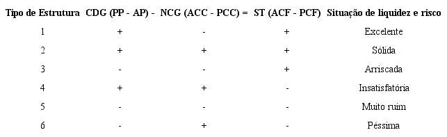 Após a reorganização dos elementos, o Modelo Fleuriet destaca três indicadores importantes que expressam as decisões da empresa em relação ao capital de giro e equilíbrio financeiro (Assaf, 2015): Capital de Giro (CDG), Necessidade de Capital de Giro (NCG) e Saldo de Tesouraria (ST). As situações possíveis por meio da combinação dos três indicadores podem ser classificadas em seis estruturas de liquidez e risco de curto prazo que determinam sua saúde financeira, como mostra a Tabela 1 (Silveira, Zanola, & Machado, 2015).