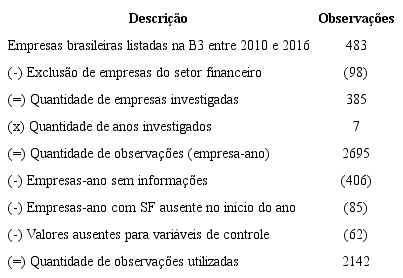 Originalmente a amostra era composta por todas as empresas listadas na B3 entre 2010 e 2016, ou seja, 483 empresas. Após a exclusão das empresas do setor financeiro devido às particularidades da estrutura patrimonial do setor, a quantidade foi reduzida a 385 empresas que, multiplicadas pelo período de análise, totalizaram 2.695 observações. Posteriormente foram excluídas as empresas-ano que não tinham suas informações divulgadas por não estarem listadas em determinado ano (406 empresas-ano), as empresas-ano que não apresentaram nenhum tipo de situação financeira no início do ano (85 empresas-ano) e as observações com valores ausentes para as variáveis de controle (62 empresas-ano) resultando em um total de 2.142 empresas-ano utilizadas, conforme detalhado na Tabela 2.