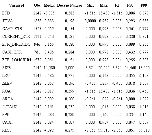 A Tabela 4 apresenta a estatística descritiva das variáveis de agressividade fiscal e variáveis de controle utilizadas. Os valores médios encontrados foram de -0,025 para BTD, 33,3% para TTVA, 25,9% para GAAP_ETR, 24,3% para CURRENT_ETR, 16,5% para ETR_DIFERIDO, 43,5% para CASH_ETR e 25,1% para ETR_LONGRUN.