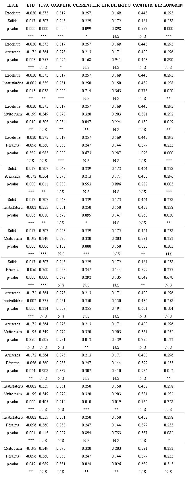 Em GAAP_ETR todos os testes com empresas em situação Excelente foram significativos com resultado dentro da hipótese levantada por esta pesquisa, indicando que empresas em situação Excelente são em média menos agressivas que empresas nos demais tipos. A métrica ETR_LONGRUN trouxe resultado semelhante para a situação Excelente e também apresenta a situação Péssima como mais agressiva que todas, com exceção da Sólida, que o teste não foi significativo. Para a métrica TTVA, empresas em situação Sólida são mais agressivas que as demais. Quando se trata de CURRENT_ETR, empresas em situação Muito Ruim são menos agressivas que as demais. Para ETR_DIFERIDO e CASH_ETR poucos foram os testes que deram significativos.