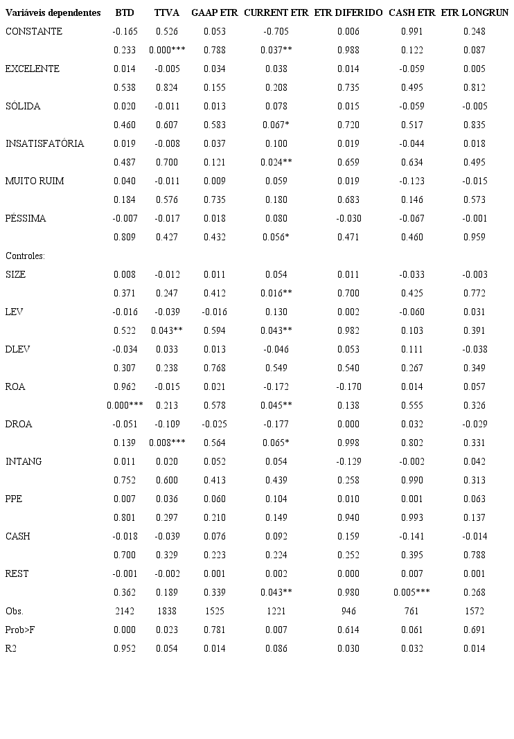 Isso é visto nos resultados encontrados para o modelo de regressão que usou dummies para as estruturas financeiras. A métrica CURRENT_ETR, que considera apenas os tributos correntes sobre o lucro, foi a única a apresentar resultados significativos para as situações financeiras. Os resultados para essa métrica sugerem que tanto nas empresas mais saudáveis quanto nas menos saudáveis a associação é positiva indicando que, mantidas todas as outras variáveis constantes, as empresas em situação Sólida, Insatisfatória e Péssima são menos agressivas que a Arriscada. A inexistência de trabalhos que abordem o assunto, tanto em pesquisas nacionais quanto internacionais, não permite que se faça uma comparação entre os resultados.