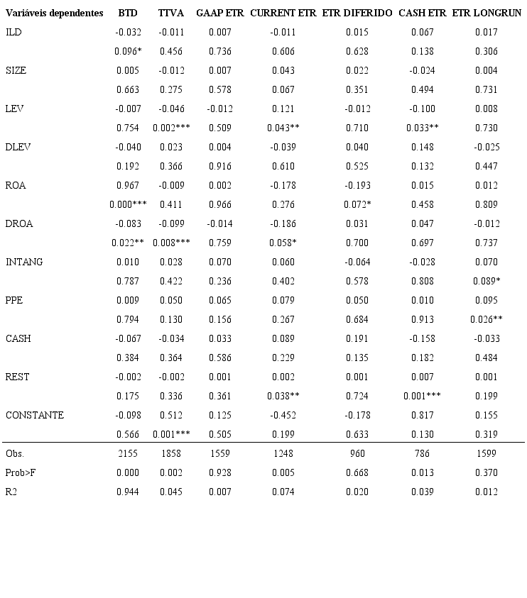 A Tabela 7 mostra o resultado das regressões para todas as métricas de agressividade fiscal como variável dependente e o ILD como variável de interesse. O teste F foi significativo para BTD, TTVA, CURRENT_ETR e CASH_ETR.