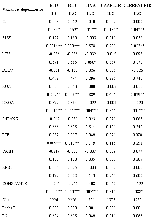 Os coeficientes em TTVA, GAAP_ETR e CURRENT_ETR para o ILG apresentam associação positiva ao nível de significância de 5%. Isso sugere que quanto maiores os índices de liquidez, menos agressiva é a empresa. Por outro lado, tanto para ILC quanto para ILG, a BTD demonstrou associação positiva ao nível de significância de 10% indicando maior agressividade quanto maior for a liquidez.