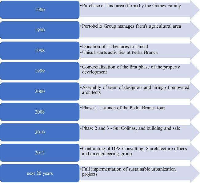 In addition, there is investment in refuse collection and recycling. There is use of the neighbourhood management model: the concept was incorporated by the residents' association. Sustainable buildings were built. In summary, to make viable all the existing infrastructure, the Pedra Branca timeline comprises the following significant events, described in Figure 2.