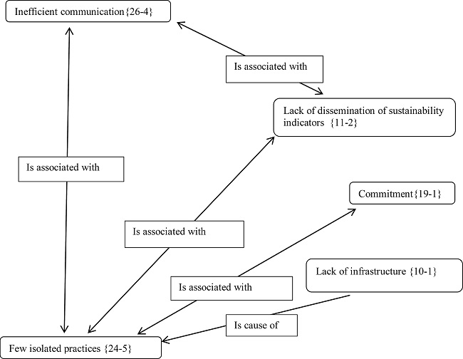 Figure 3 shows that the main tensions of sustainability mapped are associated with fragility of the synergy among residents, administrators and the university. The communication process is considered insufficient by the interviewees, and what the entrepreneurs call sustainable, in the respondents' perception, goes back to isolated practices, lacking in synergy and robustness. There is evidence that many interviewees do not cultivate values associated with sustainability, and have superficial knowledge on the subject.