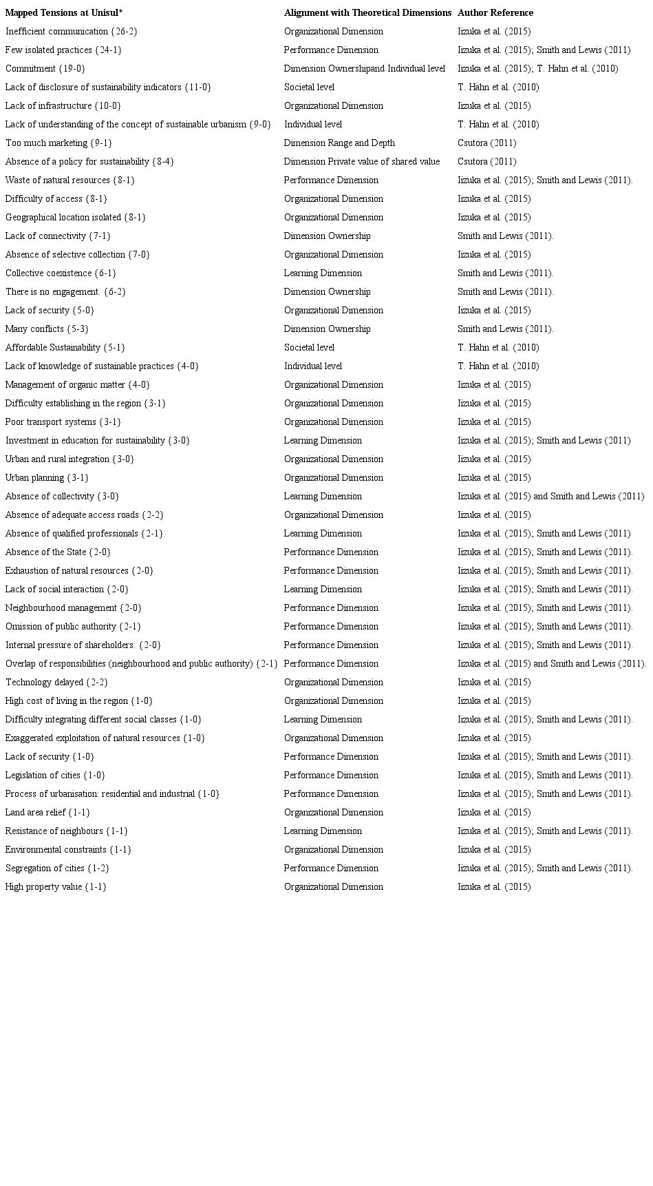 The gaps in the mapped literature indicate that the theme of tensions of sustainability has been studied very little so far (T. Hahn, Pinkse, Preuss, & Figge, 2015). There is evidence that there are inconsistencies in the integration of environmental management activities and economic and environmental performance (Wagner, 2015), which may become a constraint on greater private sector investments in sustainable practices. So far, tensions of sustainability theory have not been applied to any study on sustainable management in Higher Education.