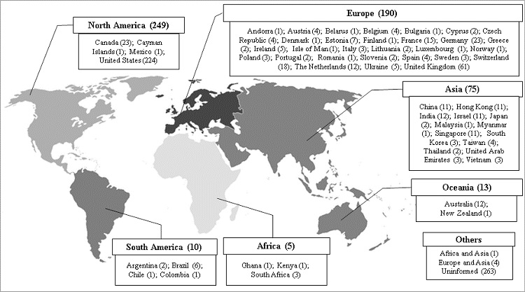 In addition to analyzing the date of foundation of the organizations that constitute the database and the analysis of the organizations founded prior to 2008, we also identified the geographical position of these organizations. With respect to it, the 810 companies that make up the sample of this study are spread over 58 countries on 4 of the 5 continents. It is important to stress that it has not been possible to identify the origin of 263 organizations (uninformed). This information is more detailed in Figure 4.