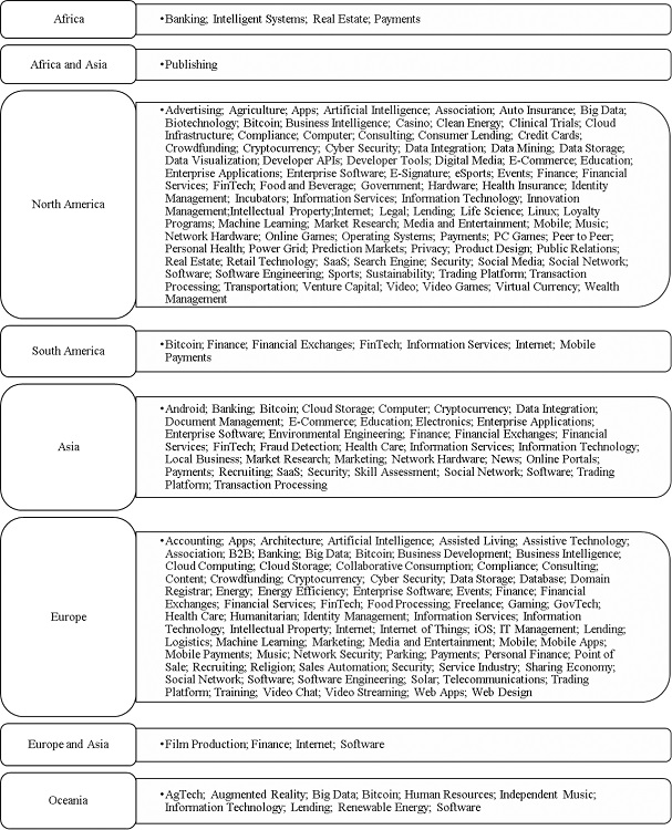 In Figure 6 shows that area 1, with consists of North America and Oceania, has several branches of activity, but one can highlight, for example, the companies in the area of technology, finance, agriculture, media. Area 2 comprises Europe, Asia and South America, and stands out, for instance, in the operation of companies in the financial area, mobile payments, Exchanges and Information Services. Finally, area 3, which is essentially composed of Africa and Asia, has a more distant focus from area 1 and 2 which have many areas in common. The area has three performances in publications and financial services.