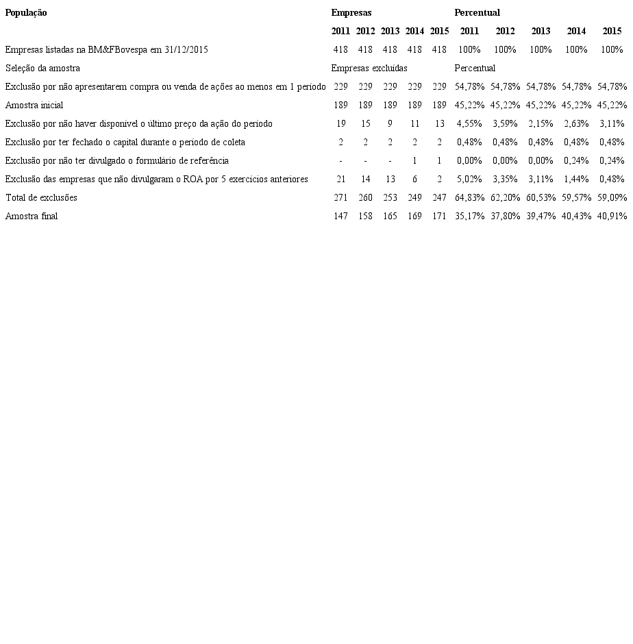 A população da pesquisa compreende empresas de capital aberto listadas na BM&FBovespa durante o período de 2011 a 2015, o que corresponde a 418 empresas. Ao efetuar a coleta de dados observou-se que em diversas empresas, seus diretores não efetuaram ao menos uma transação de compra ou venda de ações (dados necessários para mensuração da variável excesso de confiança e otimismo) durante todo o período de abrangência desta pesquisa. Acredita-se que pode haver restrições internas ou externas nas empresas que desincentivem a negociação (uma vez que tais transações poderiam influenciar na decisão dos interessados), assim, dado que a impossibilidade de transacionar ações poderia enviesar as análises, entendeu-se adequado desconsiderar da amostra as empresas que não tenham realizado pelo menos uma transação de compra ou venda de ações entre 2011 e 2015, de forma a considerar apenas empresas em que esta prática ocorre ao menos uma vez entre o período analisado. Assim, é assegurado que a empresa não restringe transações de compra e/ou venda de ações pelos diretores, e consequentemente, não havendo transação para os demais períodos abrangidos na pesquisa, considera-se que o CEO obtinha a possibilidade de negociar ações da empresa e não a fez.