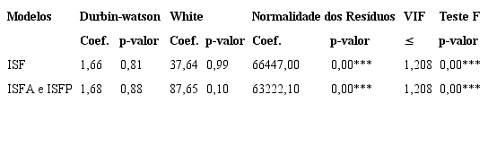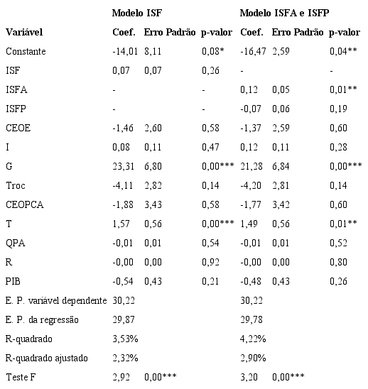 Conforme apresentado na Tabela 2, foram testados os pressupostos de uma análise multivariada para dois modelos econométricos: (a) ISF; (b) e ISFA e ISFP. O teste de Durbin-Watson apontou ausência de autocorrelação tanto para o modelo ISF (Coef. - 1,66; p-valor 0,81), quanto para o modelo ISFA e ISFP (Coef. - 1,68; p-valor 0,88). O teste de White indicou a ausência de heterocedasticidade (ISF: p-valor 0,99; ISFA e ISFP: p-valor 0,10), e O teste de Fatores de Inflacionamento da Variância, apresentou ausência de problemas de multicolinearierade (VIF ≤ 1,208). Por sua vez, apesar de o teste de normalidade dos resíduos ter rejeitado a hipótese nula de normalidade, conforme Wooldridge (2005) um grande número de observações (810 neste trabalho) faz com que seja satisfeita a normalidade assintótica dos estimadores OLS de acordo com o Teorema Central do Limite. Assim, considera-se que os pressupostos são adequados para conduzir a análise da regressão a fim de encontrar argumentos mais sólidos e responder à hipótese levantada, conforme Tabela 3, a seguir: