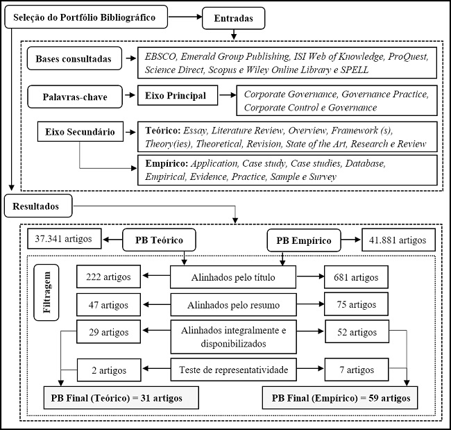 Ressalta-se que foram selecionados artigos de natureza teórica (revisões de literatura, propostas de modelos teóricos e críticos-reflexivos) e de natureza empírica (do tipo experimental, levantamento documental, propostas de modelos empíricos). Visto isso, definiram-se dois eixos de pesquisa. O Eixo Principal compreendem as palavras-chave corporate control, corporate governance, governance e governance practice enquanto que o eixo secundário foi segregado em Eixo Teórico e Eixo Empírico. A partir da definição das palavras chave, selecionaram-se as bases de dados, EBSCO, Emerald Group Publishing, ISI Web of Knowledge, ProQuest, Science Direct, Scopus e Wiley Online Library para busca da literatura internacional, e a biblioteca eletrônica Scientific Periodical Electronic Library (SPELL®) para busca nacional. A busca dos artigos teóricos nas bases de dados ocorreu de 26 de setembro a 6 de outubro de 2016, enquanto que a busca dos artigos empíricos foi realizada entre 14 e 19 de dezembro de 2016. Como parâmetro de busca estabeleceu-se a (a) pesquisa nos comandos no título, resumo e palavras-chave das bases de dados; (b) sem limitação de idioma; (c) sem limitação temporal; (d) sem delimitação de área de atuação; e (e) somente artigos publicados em journals.