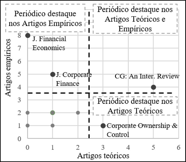 Por outro lado, na análise dos artigos empíricos, tem-se a predominância dos periódicos com escopo na área de finanças e economia, com um viés positivista. No intuito de identificar um journal que tenha uma aceitabilidade tanto de pesquisas teóricas e empíricas, destaca-se o Corporate Governance: An International Review, do Reino Unido, onde Kumar e Zattoni são os atuais editores. No entanto, nos artigos empíricos vale destacar a relevância dos periódicos Journal of Financial Economics (8 artigos) e Journal of Corporate Finance (5 artigos).