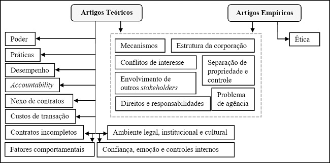 Além disso, verificou-se que os conceitos apresentados nos artigos empíricos são, em sua maioria, citações de outros autores, principalmente de Shleifer e Vishny (1997) pela perspectiva de agência. Diante disso, é possível afirmar que os estudos (principalmente empíricos) partem de um entendimento pré-determinado pela comunidade científica sobre GC, sendo perceptível de maneira geral uma afiliação à Teoria da Agência, corroborando com Aguilera et al. (2008). No entanto, vale ressaltar que dependendo da filiação teórica a compreensão da GC é diferente.