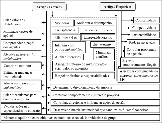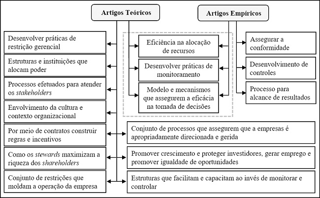 Pela análise conceitual verificou-se o destaque a elementos, como a separação de propriedade e controle, os problemas de agência, os mecanismos de monitoramento, os direitos e responsabilidades, aspectos da estrutura da corporação e o envolvimento de outros stakeholders. Em relação às funções, destaca-se o fato de assegurar o retorno do investimento, minimizar conflitos, alinhar interesses, melhorar o desempenho, monitoramento, minimizar o risco, transparência, eficiência e eficácia e função stewardship. GC, enquanto processo, reflete-se em modelos e mecanismos que assegurem a eficácia na tomada de decisões, desenvolvimento de práticas de monitoramento e na eficiência na alocação de recursos.
