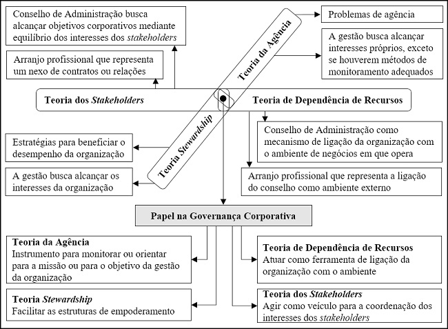 Porém, verificou-se também a inserção de outras perspectivas teóricas, como por exemplo, Teoria de Dependência de Recursos, advinda da sociologia (Aguilera et al., 2015; Christopher, 2010, 2011; Daily et al., 2003; Gugler, Mueller, & Yurtoglu, 2008; L'Huillier, 2014; Turnbull, 1997; Yoshikawa, Zhu, & Wang, 2014). Essa Teoria é voltada para a estrutura da organização e sua relação com o ambiente externo, sendo a influência de expertise do conselho de administração, um dos aspectos mais explorados. Destaca-se também a Teoria Stewardship, que considera que o gestor busca trabalhar no intuito de alcançar o melhor resultado para a empresa e seus shareholders, e não para alcançar de benefícios de interesse próprio (Christopher, 2010, 2011; Daily et al., 2003; L'Huillier, 2014; Turnbull, 1997). Por fim, tem-se a Teoria dos Stakeholders, cuja visão não é pautada somente no benefício do acionista (como na Teoria da Agência), mas também nos funcionários, credores, fornecedores, entre outros grupos de interesse (Aguilera & Jackson, 2010; Christopher, 2010, 2011; Daily et al., 2003; Huse, 2005; L'Huillier, 2014; Turnbull, 1997).