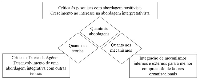 A partir dessa taxionomia de integração de aspectos de diferentes teorias, vislumbra-se um leque de oportunidades de pesquisa, que contribuem para o avanço teórico da área. Nesse sentido, Aguilera et al. (2008) destacam a importância de abordar nos estudos de governança a perspectiva de open system com abordagens organizacionais, por considerar as características da organização como interdependentes com diversidade, flutuações e incertezas do ambiente.