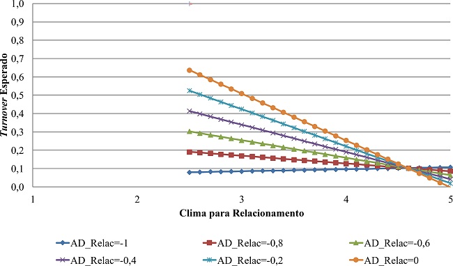 As Figuras 1 e 2 mostram o efeito moderador de força de clima na relação entre clima e turnover para Suporte Gerencial e Relacionamento, respectivamente. Em ambos os gráficos, é possível observar que, quanto maior o escore da força de clima, maior é a inclinação da reta. Assim, tem-se que, quando a força de clima é alta, o efeito do clima no turnover é reforçado, ao passo que a força de clima baixa enfraquece essa relação. Esses resultados fornecem suporte para a Hipótese 2.