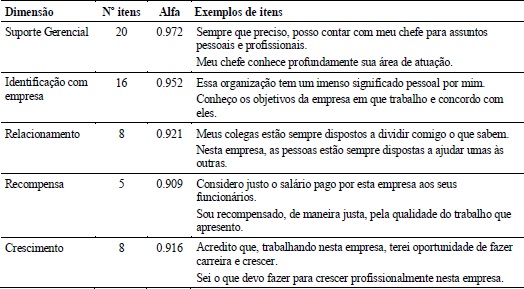 Dimensões de clima organizacional: uma análise fatorial exploratória foi feita utilizando a matriz de correlações dos 67 itens do questionário de clima, via método das componentes principais, e foram extraídos oito fatores utilizando o critério de ter pelo menos 70% da variabilidade total dos itens explicada pelos fatores (70,2% de variabilidade explicada). Além disso, foram calculados os escores fatoriais rotacionados via VARIMAX para facilitar a interpretação dos resultados. Dos oito fatores, três deles foram descartados da análise, porque os índices de concordância (ICCs) ficaram aquém de parâmetros aceitáveis para agregação. Assim, permaneceram na análise as seguintes cinco dimensões de clima: (a) Suporte gerencial, que se relaciona à qualidade percebida das competências do(a) gestor(a) perante o indivíduo e sua equipe; (b) Identificação com empresa, compreendida por orgulho, senso de pertencimento, concordância com os objetivos e estratégia da empresa, bem como seu impacto na sociedade; (c) Relacionamento, ou seja, como são o ambiente social e a relação do indivíduo com outras pessoas, da sua área ou não; (d) Recompensa, cujas percepções estão relacionadas com a troca do seu trabalho por remuneração e recompensas não financeiras; (e) Crescimento, que está ligado à carreira e às perspectivas de desenvolvimento profissional na organização. A Tabela 1 apresenta os exemplares de itens, os números de itens e o alfa de cada dimensão de clima.