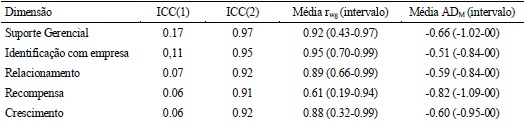 Para que fosse possível agregar os escores individuais (clima psicológico) em um nível de análise organizacional (clima organizacional), medidas de confiabilidade e concordância entre avaliadores largamente utilizadas na literatura de clima foram calculadas para garantir que a agregação pudesse ser feita (James, 1982). Na Tabela 2, tem-se os valores das correlações intraclasse ICC(1) e ICC(2) para verificar confiabilidade na diferença entre grupos, assim como os valores de concordância rwg em cada uma das escalas. Os resultados mostram-se satisfatórios, com bons níveis de confiabilidade, com valores de ICC(2) bem acima do parâmetro de 0.7 e valores de ICC(1) de 0.06 a 0.17, que estão dentro de intervalos aceitáveis para este índice (Bliese, 2000; LeBreton & Senter, 2008). Já para a medida de concordância, os valores médios de rwg estão todos acima da nota de corte usual de 0.7, à exceção de recompensa. Porém, como as outras medidas mostraram bons ajustes, essa dimensão foi mantida na análise.