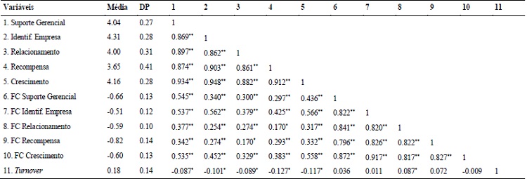 As médias, desvios padrões e correlações entre as medidas de clima, força de clima e turnover são apresentadas na Tabela 3. Pode-se observar que todas as dimensões de clima apresentaram relação negativa com turnover, como esperado. Embora as correlações entre as medidas de clima sejam relativamente altas, a análise fatorial exploratória e as medidas de confiabilidade indicam a existência de diferentes construtos dentro da escala completa de clima.