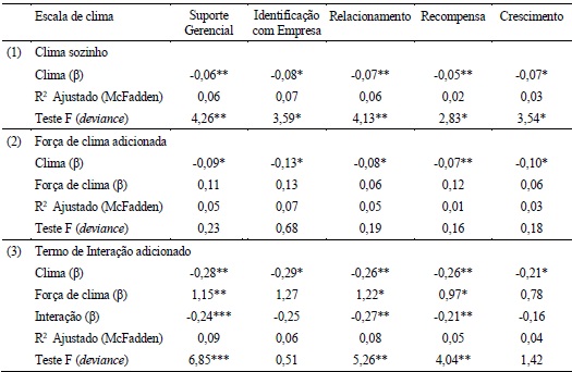 Além disto, como estudos prévios (Bliese & Halverson, 1998; Gonzáles-Romá & Peiró, 2014) alertam, uma vez que a força de clima se baseia em medida de dispersão (no caso, desvio absoluto médio) e o clima organizacional é representado pela média de percepções de clima, ambos são interdependentes. De fato, para todas as dimensões de clima, as duas medidas são positivamente correlacionadas, conforme Tabela 3. Por esse motivo, cada preditor foi inserido hierarquicamente na regressão, de forma a avaliar se a adição da variável produziria um aumento significativo na qualidade do modelo (pseudo R2). Também foi testada a contribuição de cada variável no modelo e, para tanto, foi utilizado um teste que se baseia nas funções desvios (deviance) para produzir estatísticas de teste equivalentes a um F-parcial, isso porque os modelos lineares generalizados não possuem R2, pois são estimados por máxima verossimilhança (Casella & Berger, 2011).