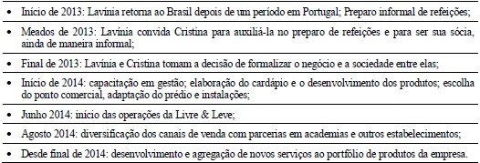 Além da inovação em produto, desde agosto de 2014, a Livre & Leve tem desenvolvido novos canais de distribuição, como a revenda de seus produtos em estabelecimentos aderentes à proposta de valor da empresa. Esses canais foram escolhidos considerando o público que cada um deles atinge, ou seja, público propenso a consumir os produtos que a Livre & Leve oferece. Dessa forma, além de divulgar e aumentar a conscientização da marca, esses canais expandiram o alcance dos produtos da Livre & Leve, aumentando o seu faturamento e possibilitando um crescimento mais acelerado. Hoje, a empresa conta com quatro pontos de venda, além da loja própria: academia Companhia Athletica e academia Bodytech em Ribeirão Preto; loja Ponto Natural em Ribeirão Preto; e loja Capim Cidreira em Franca. Além dos canais de venda, a Livre & Leve tem desenvolvido parcerias com nutricionistas, com o objetivo de expandir a conscientização e recomendação da marca. Outra inovação são os projetos para agregar novos serviços ao portfólio da empresa. Alguns novos serviços que estão sendo desenvolvidos são os cursos de gastronomia e acompanhamento nutricional. O objetivo desses projetos é, além de agregar valor ao cliente, possibilitar o uso eficiente do espaço e recursos que a empresa possui, como a cozinha e o conhecimento técnico das sócias. Na Tabela 1 é apresentado um sumário cronológico do negócio.