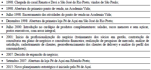 O ano de 2015 foi dedicado ao desenvolvimento do novo planejamento estratégico do Pé de Açaí. Nele, os sócios definiram como objetivo principal a expansão do negócio com a abertura de mais duas lojas. Eles desejam que o crescimento seja orgânico e não têm a intenção de transformar a marca em uma franquia. A Tabela 2 mostra o desenvolvimento do negócio cronologicamente.