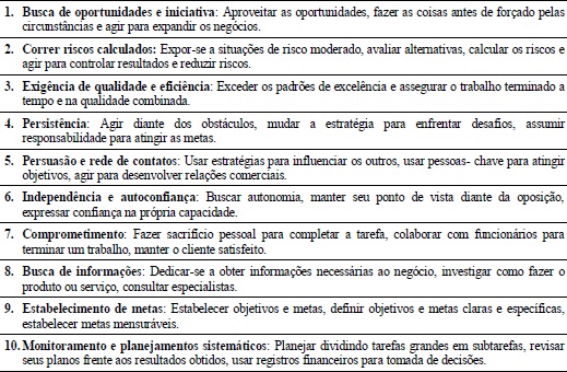 Segundo Dornelas (2001), as características empreendedoras envolvem: visão de futuro; capacidade para tomar decisões; saber identificar e explorar ao máximo as oportunidades; determinação; dinamismo; dedicação; capacidade de networking; planejamento; conhecimento; capacidade de assumir riscos calculados; e criação de valor para a sociedade. Para Degen (1989) e McClelland (1972), o empreendedor é aquele que apresenta predisposição para trabalhar continuamente até alcançar os objetivos, quando desafiado por uma oportunidade. É aquele também que identifica a oportunidade, determina os recursos necessários, organiza-os e conduz o desempenho da organização. Os estudos de McClelland são a base para uma das mais utilizadas classificações para características do comportamento empreendedor (adaptado de SEBRAE, 2013), conforme apresentado na Tabela 5.