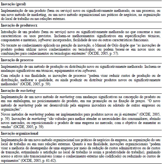 O Manual de Oslo (OCDE, 2005) divide a inovação em quatro áreas: produto, processo, marketing e organização. Assim, de acordo com o referido Manual uma inovação consiste na "implementação de um produto (bem ou serviço) novo ou significativamente melhorado, ou um processo, ou um novo método de marketing, ou um novo método organizacional nas práticas de negócios, na organização do local de trabalho ou nas relações externas." (OCDE, 2005, p. 55)
